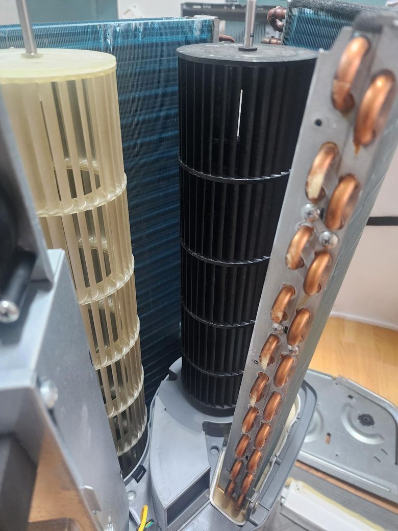 질문창문형 에어컨 분해 청소후 송풍팬 문제 생겼습니다