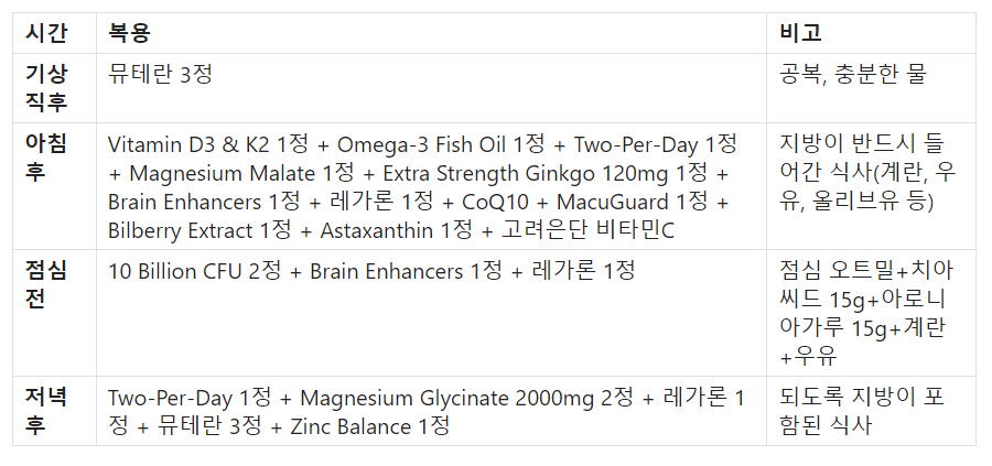 복용하시는 영양제의 종류가 다양한 것으로 보입니다. 추가 복용시 간과 신장에 부담이 안가게 조절이 필요 할 수 있겠습니다. 기존에 복용하시는 성분중 마그네슘 성분이 높은 것으로 보입니다. 조절을 하셔도 좋겠습니다.