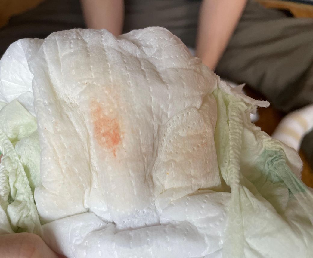 생후 4개월차 아기입니다. 기저귀를 교체한다고 기저귀를 벗기면서 봤는데 기저귀에 소변이랑 붉은색 액체가 묻어 있었어요.