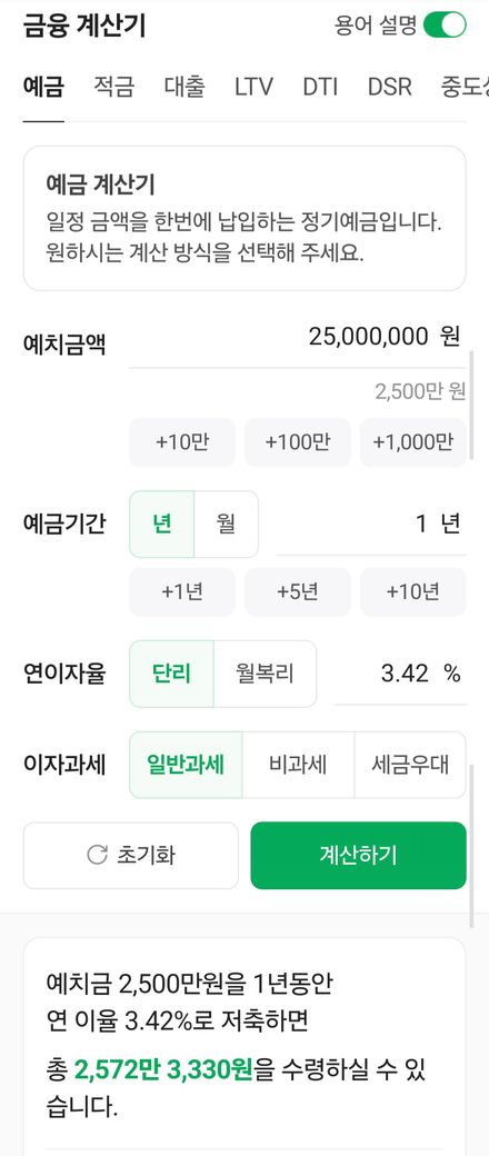 네 잘못 계산된 부분이 있는데 네이버 계산기로는 1년을 계산하셨고 현재 우리은행 계좌는