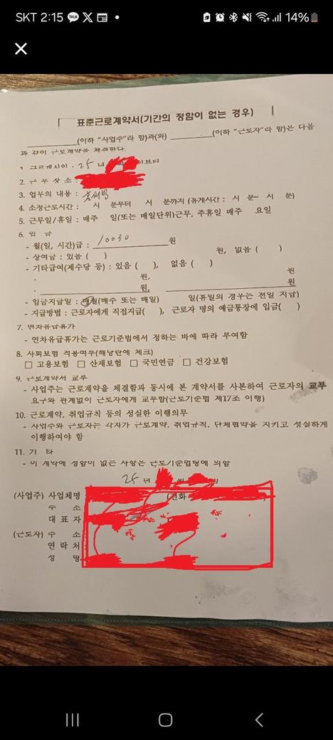 근로계약서 부실 및 실물 교부 없이 사진으로 찍어가기만 했습니다.
