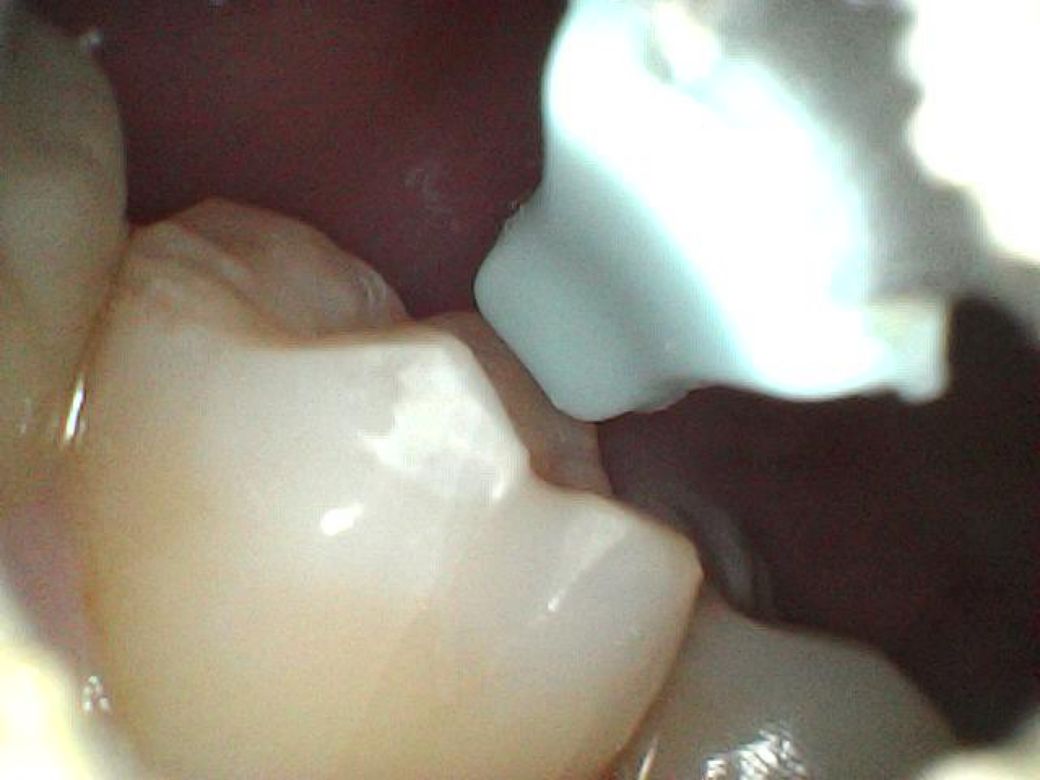 사진으로는 정확하게 보이지 않습니다. 평소에 매끈했던 부위가 꺼칠거리는 느낌이 든다면 과도한 힘 등으로 인해서 치아가 마모나 파절이 되었을 수 있습니다. 자세한 확인을 위해서 치과에서 진료를 받아보는 것을 권유드립니다.