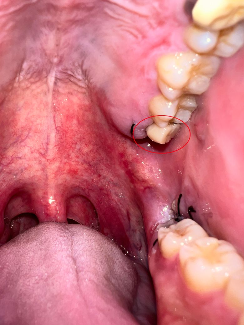 윗 잇몸 꼬맨 자리에 하얀 덩어리가 이처럼 생겨났는데 혀로 만져보면 말랑말랑 하고 통증은 없습니다.