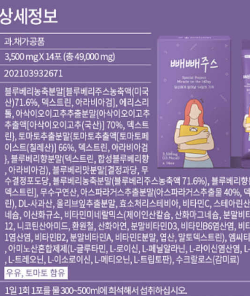 또한 빼빼주스로 영양제를 복용하는 경우 흡수율이 떨어질 수 있으니 영양제는 반드시 생수로 복용하세요.