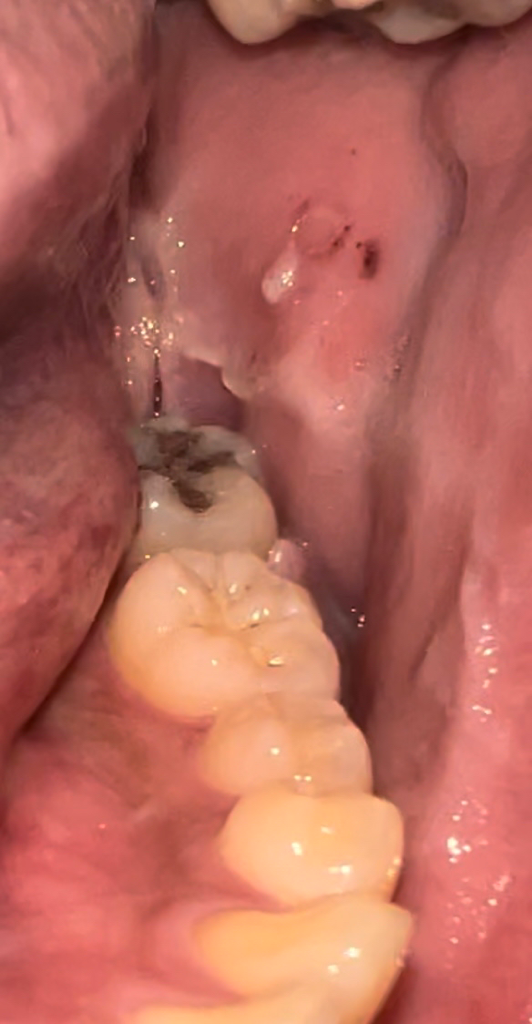무의식중에 어금니를 꽉 깨물(고 잠을 자)면 윗니와 아랫니가 맞닿는 부위의 점막 마찰이 생깁니다.
