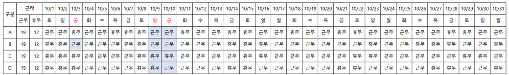10월은 캘린더 데이 31일, 휴무는 총 12개(공휴일 포함), 근무 19일로 스케쥴을 작성합니다.