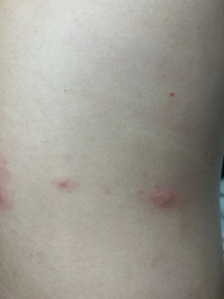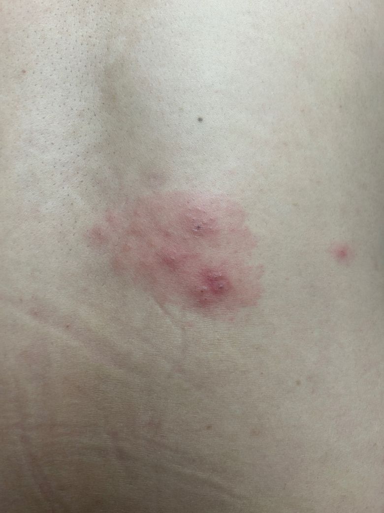 처음엔 몇 개만 있었고 손으로 누르면 통증이 있습니다. 지금은 옆으로 점점 퍼지는 형태로 발진이 나타나고 있어요. 통증은 없어요.