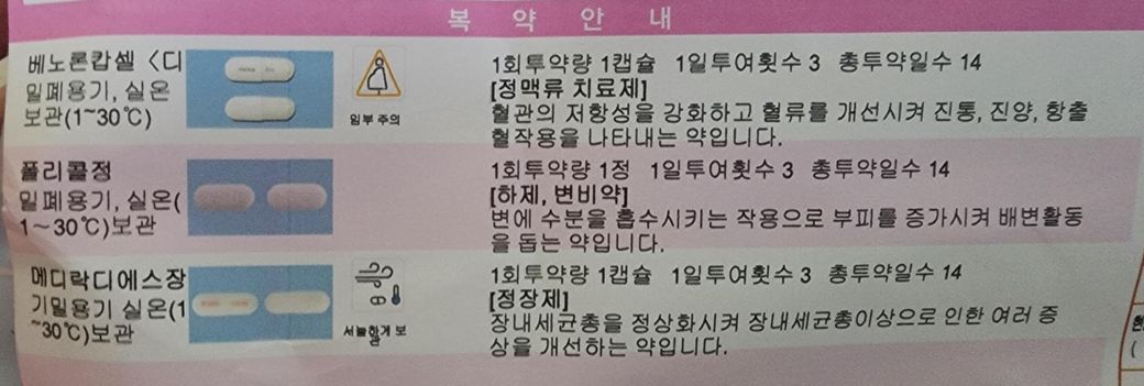 치질약에는 혈관을 강화시켜주고, 변을 부드럽게 볼 수 있게 변비약과 유산균이 들어있습니다.