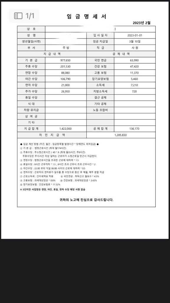 밑에는 급여명세서 입니다. 3월10일분!