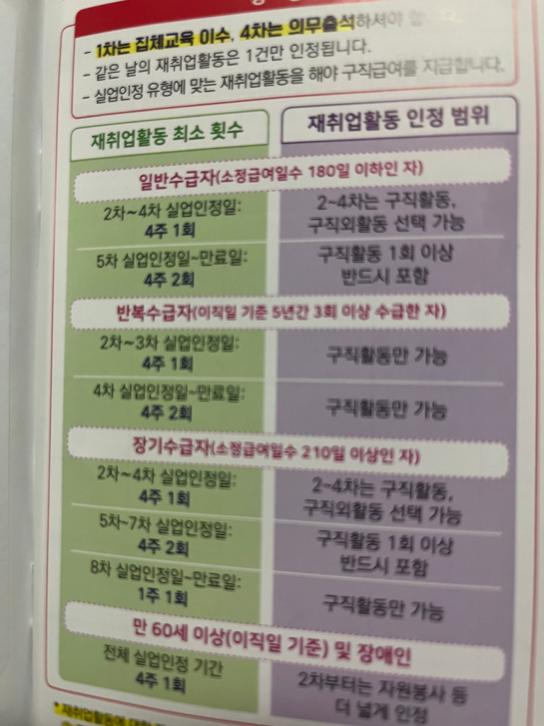 질의의 경우 표와 같이 정해진 횟수 이상의 재취업활동이 이루어진다면 실업급여 수급이 가능할 것으로 판단됩니다.