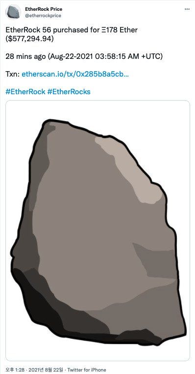 해당 NFT는 ‘이더락(EtherRock)’이라는 이더리움 블록체인의 첫 번째 수집형 NFT(Non-fungible Token·대체 불가 토큰) 시각물로서 100개만 있는 것으로 알고 있습니다.