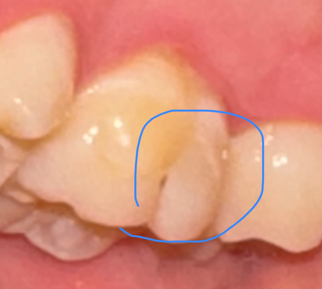 사진을 보면 다른 치아는 다 노란빛이 도는데 동그라미 친 부분만 하얀듯한 느낌이 드는데요
