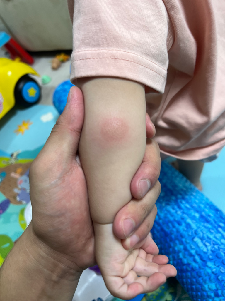 아이의 팔에 병변이 보여 걱정스러우시겠습니다.