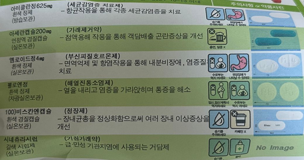 처방받으신 약들 중 아미클란정625mg이 항생제로, 장내 환경에 영향을 주어 경구피임약의 효과를 떨어뜨릴 가능성이 있습니다