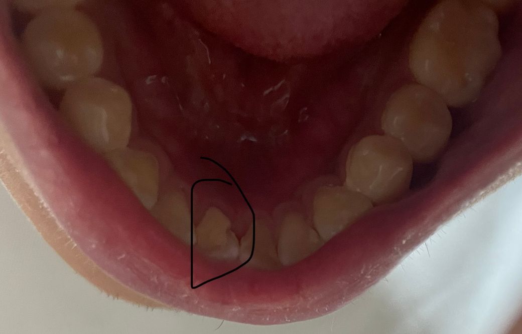 안녕하세요 치과의사 김철진입니다. 사진상으로 보면 치석이 많이 쌓여서 한쪽 치석이 떨어져 나간거 같습니다 .치과에 가셔서 스켈링을 받으셔야될것같습니다.