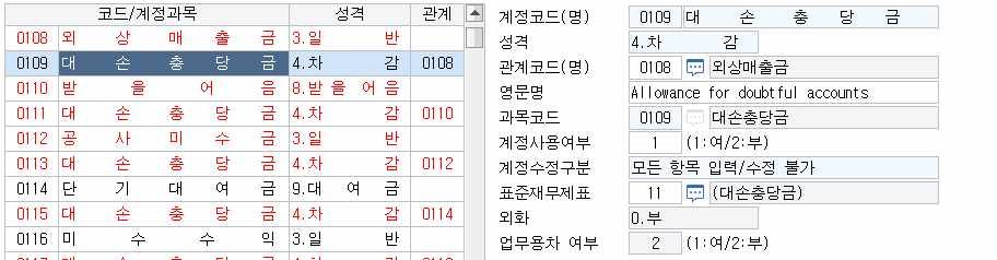 예를 들면 외상매출금과 대손충당금의 각 코드번호만 맞고, 관계코드명만 맞으면 감점 사항 없나요?