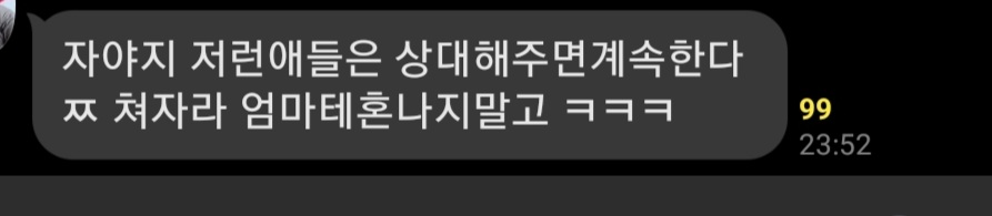4. 이후에도 A는 여러 내용으로 빈정 거리며 대표적으로 "사람성질잘긁는듯 ㅈㅍㅁ가 ㅋㅋㅋ" 와 "저도그러고싶은데 ㅉㄸ스타일하나가 뚤린입이라고 막말하네요" / "너나 예의 갖춰" / "자야지 저런 애들은 상대해주면 계속한다 ㅉ 쳐자라 엄마한테 혼나지 말고" 등 불쾌한 채팅 내용을 보내었습니다