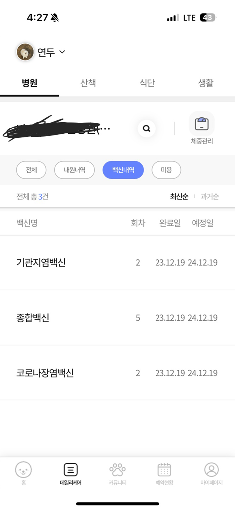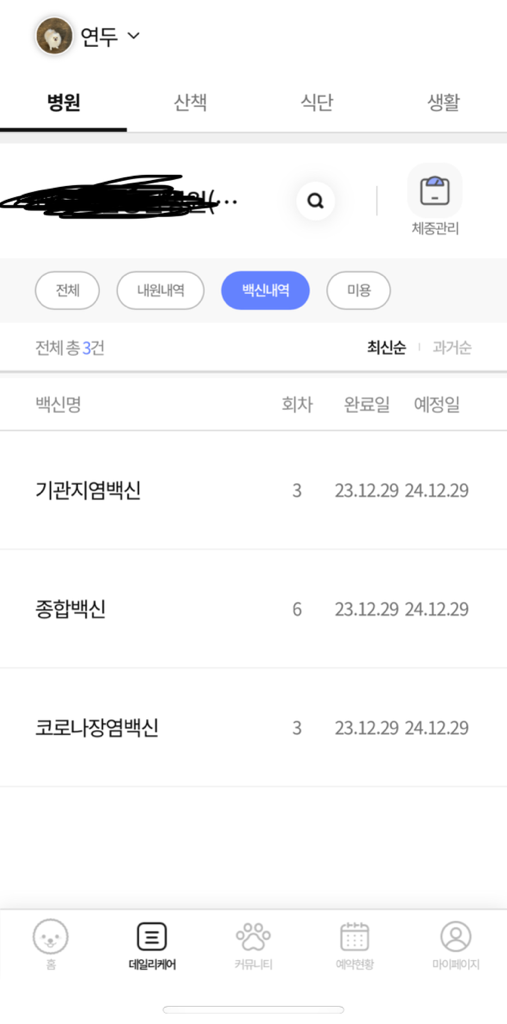 지난주에 백신 3개(종합, 켄넬, 코로나)맞고 오늘 나머지 2개(광경, 인플)맞는날인데, 병원에서 실수로 지난주에 맞은 3개(종합, 코로나, 켄넬)또 접종해버림