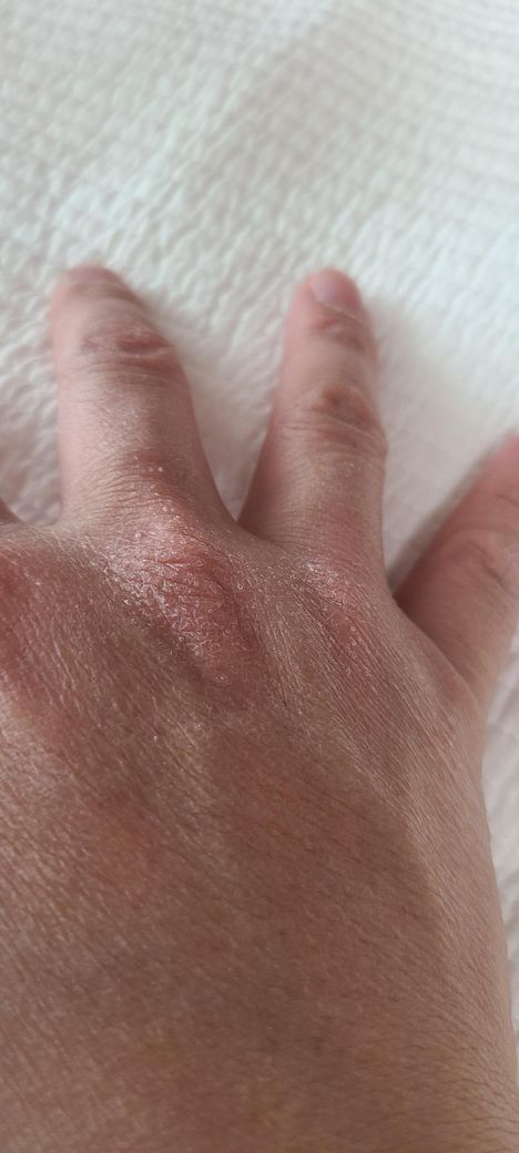 사진과 경과를 종합하면 가장 가까운 진단은 각질박리증(keratolysis exfoliativa) 입니다. 감별로는 한포진(dyshidrotic eczema) 이 있습니다.