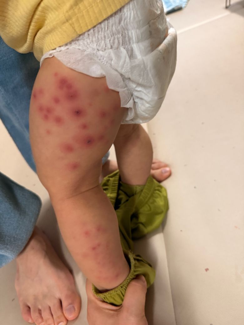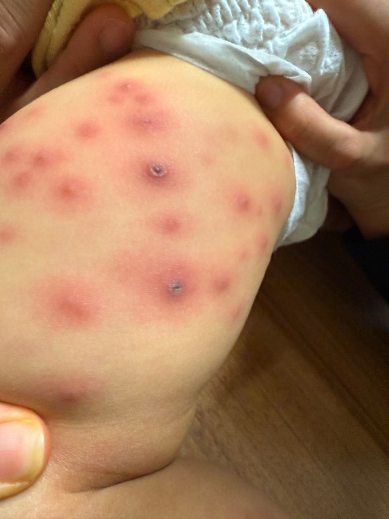 가장 중요한 감별은 포도상구균이나 연쇄상구균에 의한 농가진의 심화형, 다발성 피부농양, 또는 봉와직염입니다. 특히 중심에 검은 점이나 딱지처럼 보이는 병변은 농 형성 또는 괴사 초기 소견일 수 있습니다. 16개월 영유아에서 고열과 함께 이런 병변이 나타나면 전신 세균 감염으로 진행할 위험도 배제할 수 없습니다. 곤충 교상 후 2차 세균 감염도 가능하지만, 현재 열과 진행 속도를 보면 단순 알레르기 반응만으로 설명되지는 않습니다.