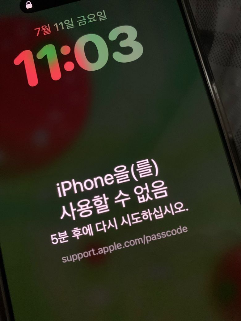 사진속 메시지는 아이폰 잠금화면에서 잘못된 비밀번호(암호)를 여러 번 입력했을떄 나타나는 정상적인 보안 반응입니다. 누군가 아이폰 잠금 번호를 여러번 틀리게 입력하면 나오는 메시지로 5분 기다렸다가 다시 비밀번호를 정확히 입력해보세요. 비밀번호가 생각나지 않으면 더 이상 시도하지 맙니다. 계속 틀리면 완전히 잠겨 복구과정이 필요합니다