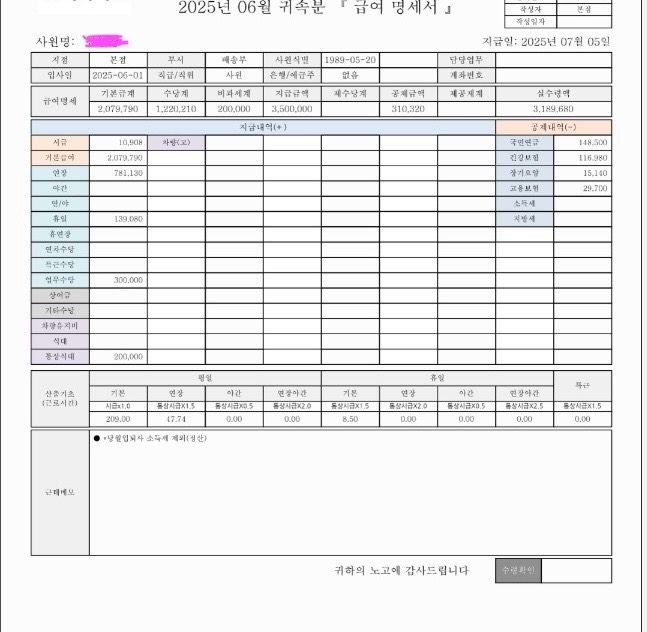 월급명세서 맞게 들어오고 나간게 맞는지 봐주세요