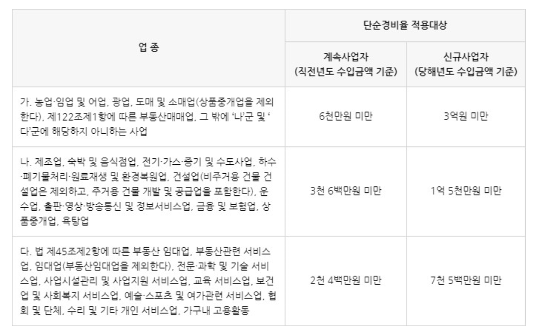 신규사업개시자의 경우 당해년도 수입금액이 다음의 금액 미만이 경우에는 단순경비율로 추계신고할 수 있습니다.