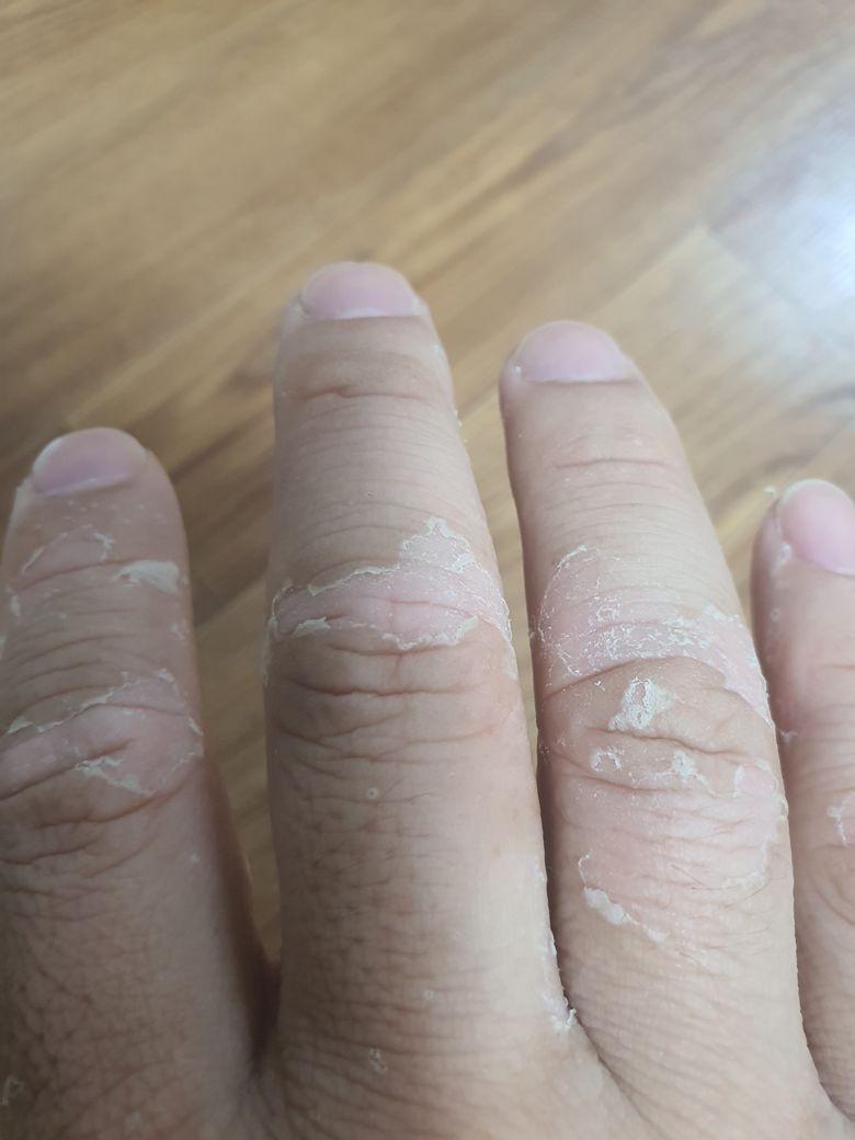 수부 습진입니다. 평소에 물을 많이 만지시는지 모르겠네요. 아니면 화학약품을 취급하거나요. 가급적 보습제를 바르고 각질은 제거하지 않는 것이 좋습니다. 스테로이드 연고가 필요하니 피부과에 가보시고, 평소에는 물이나 자극적인 물질, 세제 등은 닿지 않도록 주의하시기 바랍니다.