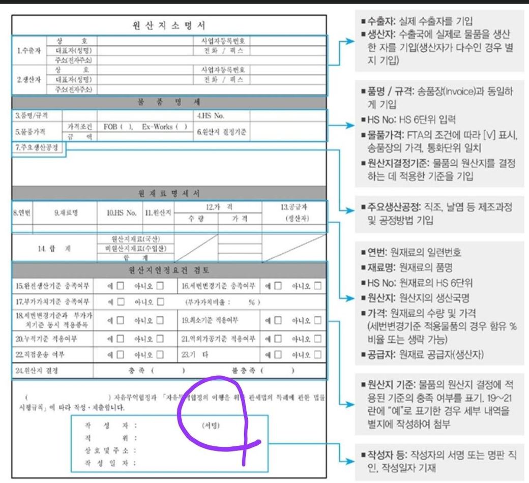 수출자는 원산지 소명서 작성시 작성자 서명 도장을 추가 하면 됩니다.