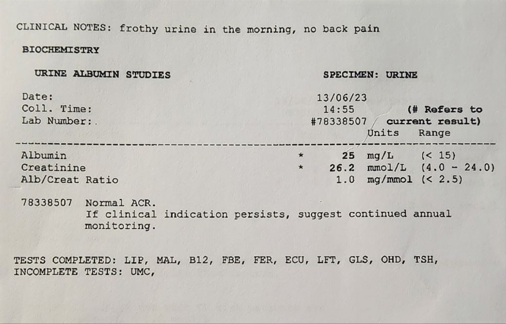 첨부한 사진은, 제가 2023년 6월 초에 병원에서 소변 검사를 받고 나서 받은 결과인데, 당시 마이크로 알부민뇨 판정을 받았었습니다. 상담 결과, 의사 선생님 말씀으로는, eGFR 88 Normal limit 판정을 받았었고, 크게 신경 쓰지 않아도 되지만 만약 걱정이 많이 된다면 3달 뒤에 소변 검사를 한번더 봐보라고 하시더라고요.