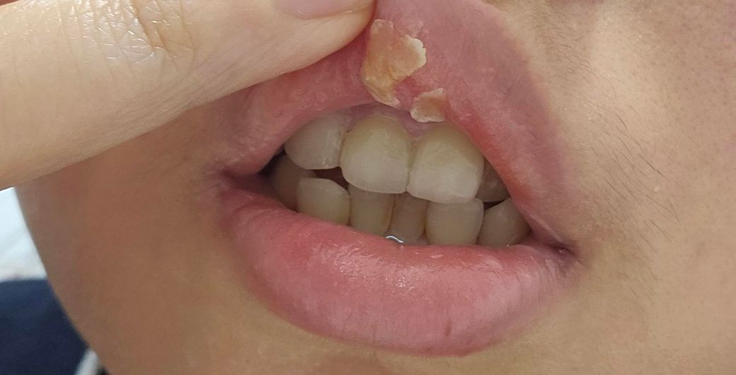 사진만 봐서는 상순 봉합 후 치유되면서 생겼던 가피정도로 보입니다 더이상 자극하지는 마시고 치유되도록 경과관찰 하시기를 바랍니다. 이후에 이상 있을 시 즉시 구강악안면외과 등 내원하시기를 바랍니다.