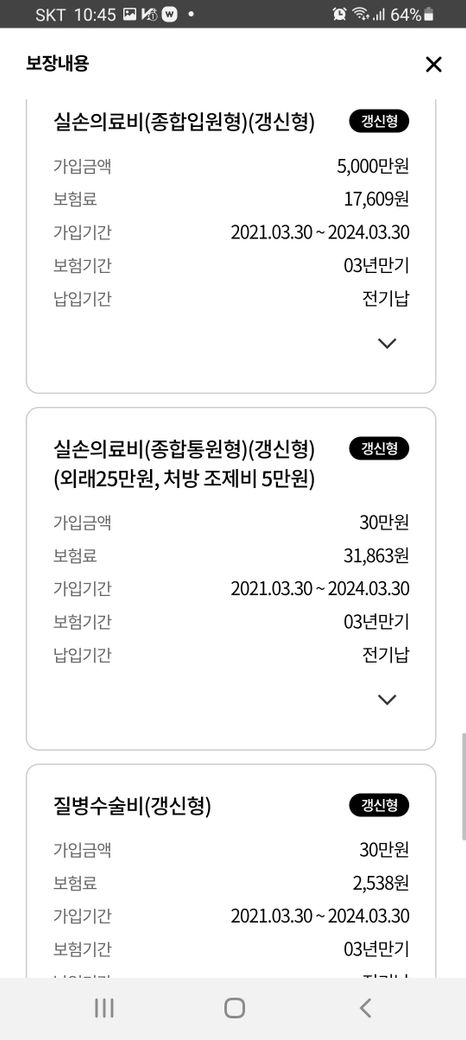 가입시 보험료는 5만원 정도 였는데 지금은 월 10만원 정도에요 (이중 갱신형 항목 3가지가 5만원정도 에요)