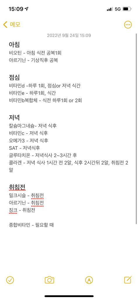 저녁 식후:칼슘 마그네슘 / 비타민C /오메가3 / SAT / 글루타치온
