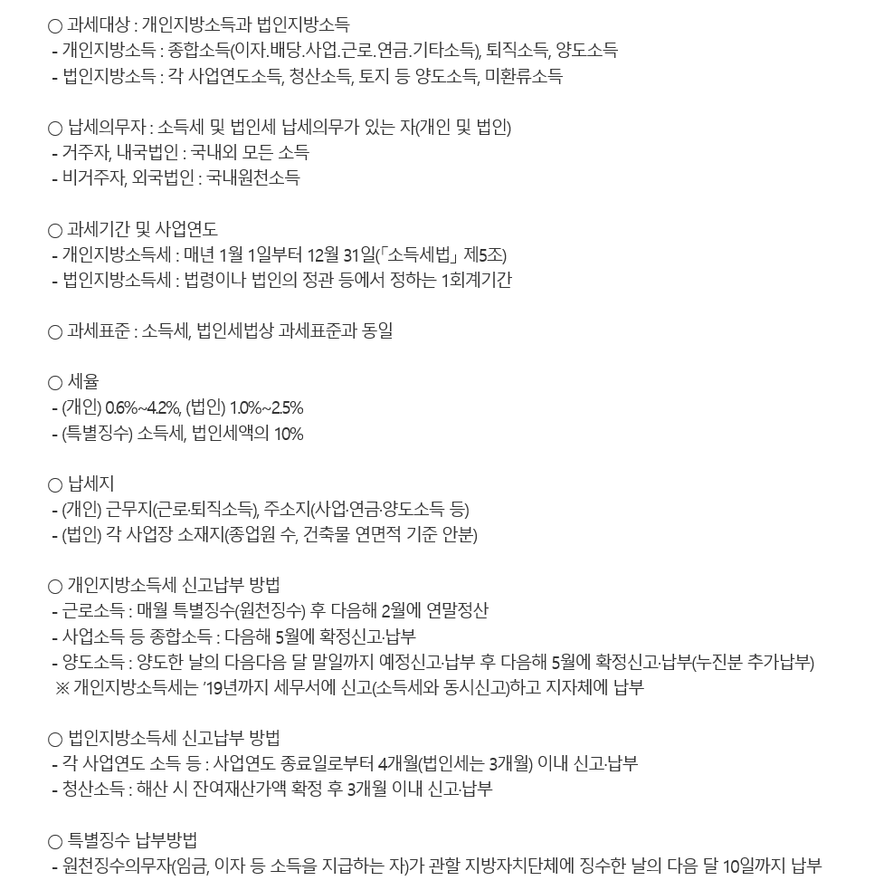 일반적으로 개인지방소득세는 급여에서 공제하는 근로소득 원천세의 지방소득세 분이고 주민세는 주민등록에 따른 개인분 주민세와 사업자인 사업주가 부담하는 사업장분 주민세등이 있습니다.