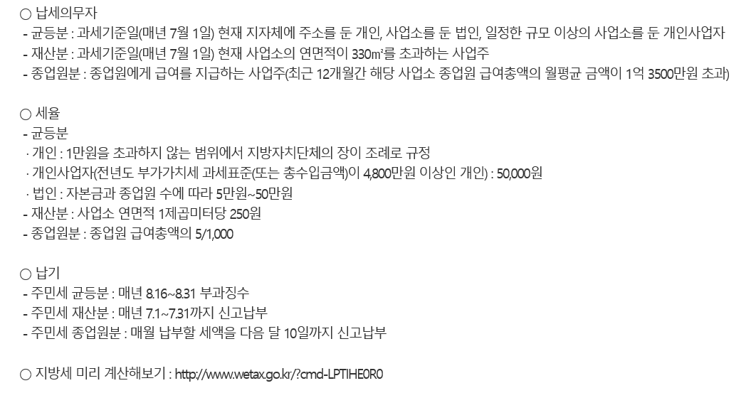 반면 주민세는 별도의 세목으로서 다음과 같습니다(지방세법 제74조)