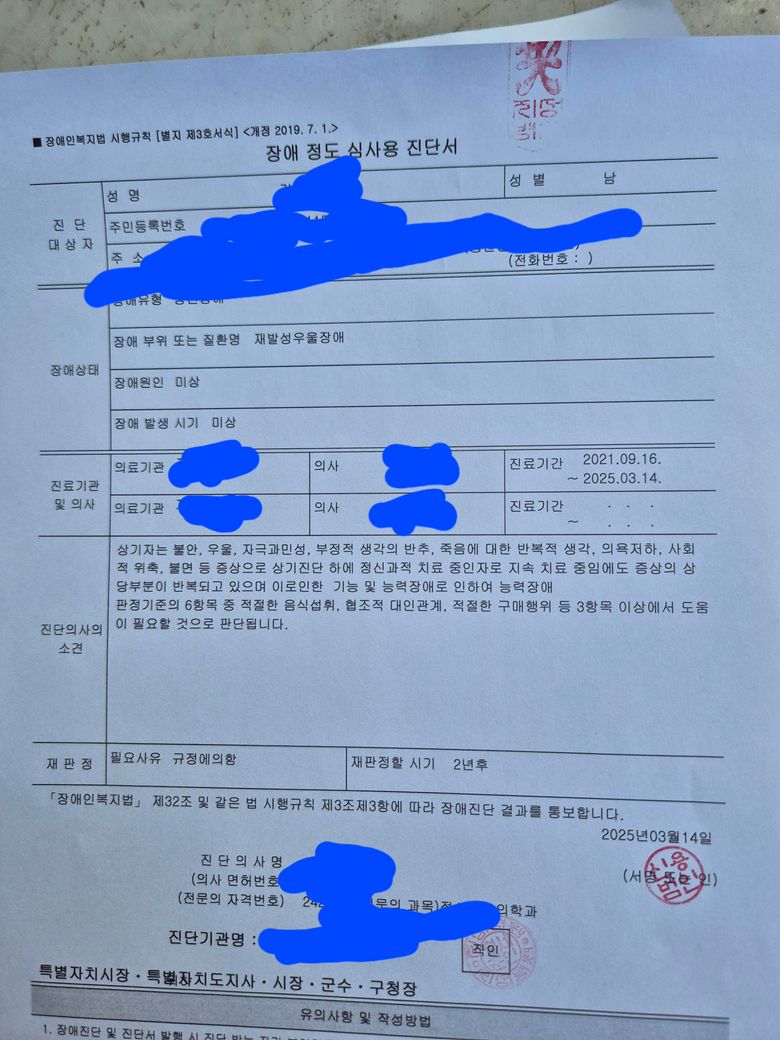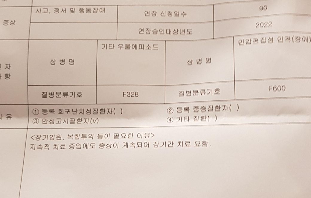 보시다시피 폐쇄병동에 6개월간 입원도 했었구요 지금 기초수급자 근로능력없음으로 3번연속 나왔었거든요