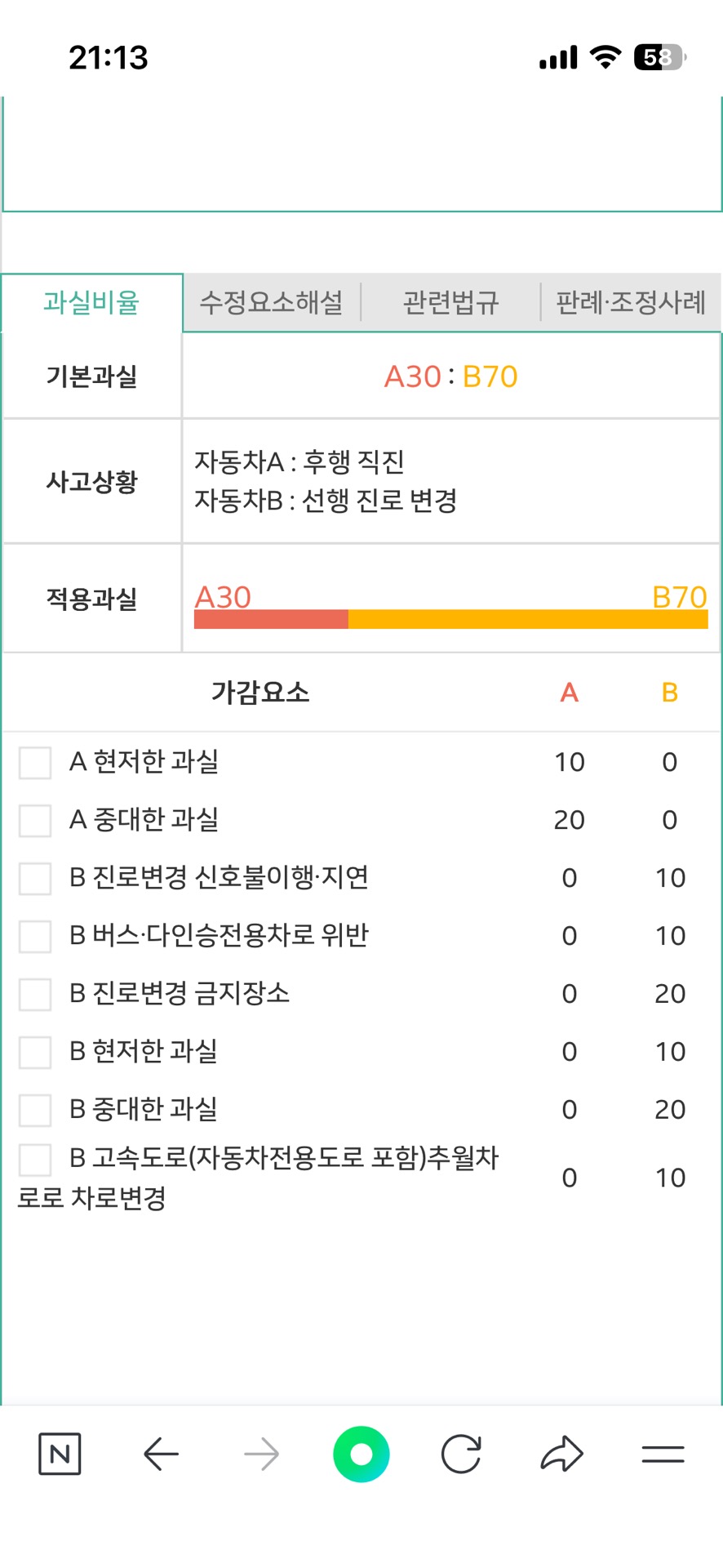 1명 평가차선변경 사고의 경우 차선을 변경한 자동차 과실이 많습니다.