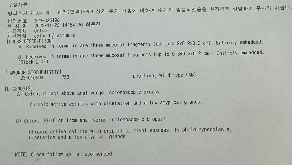 이번에 대장 내시경하고 궤양성 대장염에 대장에 모가 있다고 들었고 다음주 수술할거 같은데 조직검사 결과가 궁금해서 판독 부탁드립니다. 항상 감사합니다.