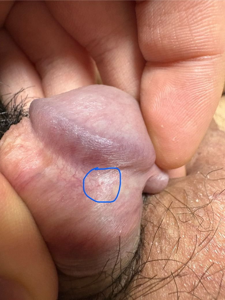 사진의 부위인 귀두 아랫부분에 물집처럼 보이는게 있어 질문 드립니다. 증상은 아무런 증상도 없습니다.각도에 따라서 보이기도 하고 안보이기도 합니다. 정상 피부인가요, 아니면 물집인가요? 혹시