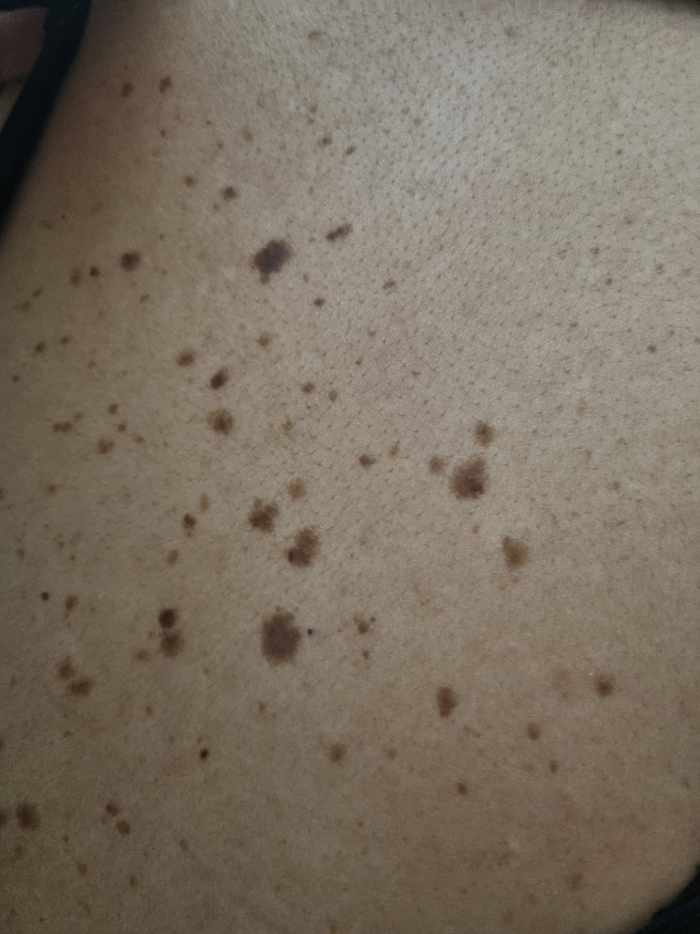 멜라닌세포모반으로 보이며 양성 병변이므로 당장 큰 걱정은 없을 가능성이 높으나 일부에서 흑색종과 같은 질환의 위험이 높아지므로 피부과를 방문해 진찰받아보시기 바랍니다.