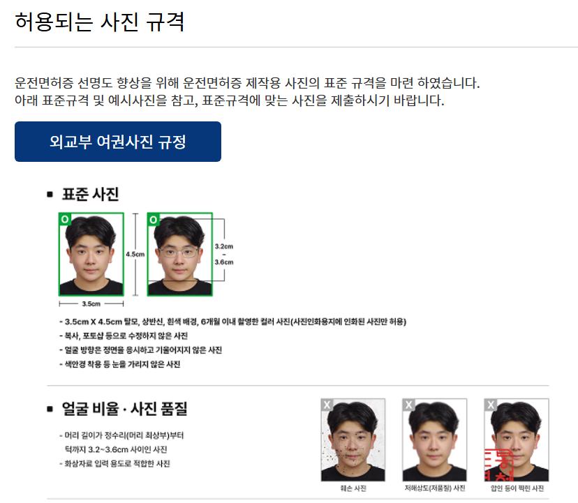 안녕하세요. 정명승 행정사입니다. 운전면허 사진의 경우 표준 규격이 마련된 것으로 보이며 3.5 x 4.5 여권용 표준규격에 맞는 사진을 쓰면됩니다. 사진관에서 운전면허 사진을 찍으러 왔다고 하면 여권용 표준규격 사이즈로 찍어주실겁니다 ^^ 자세한 내용은 아래 사이트를 확인해보세요 감사합니다.