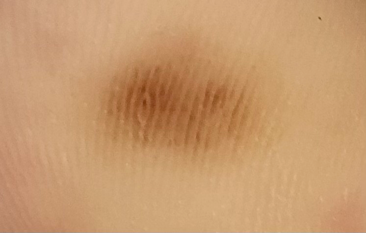 귀하의 경우, 갈색 얼룩이 몇개월 동안 지속되고, 크기나 색깔이 변하지 않았다고 하셨습니다. 또한, 아무런 증상이 없다고 하셨습니다.