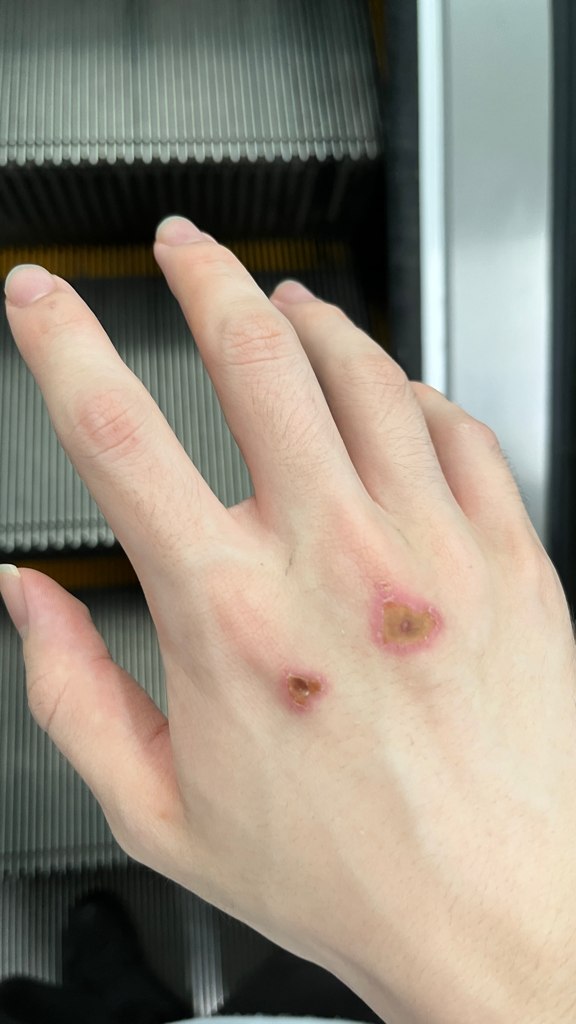 피부가 깊게 손상받으며 가피가 형성된 것으로 보이는데, 상처 하루에 이틀씩 연고 바르면서 지켜보시고 잘 아물지 않는 것 같으면 피부과를 방문하시기 바랍니다.