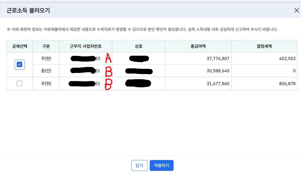 위에만 선택을 할까 했는데 B회사에서 발행한 원천징수액을 보니 31,677,860원(주현)의 급여였더라구요.