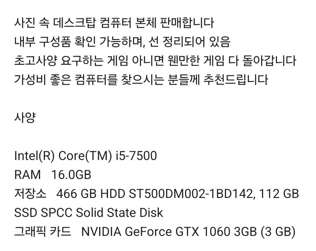 일단 게임용으로 하기엔 성능이 7~9년정도 구형 사양이기 때문에 아무리 GTX1060 3GB가 있다고 하더라도
