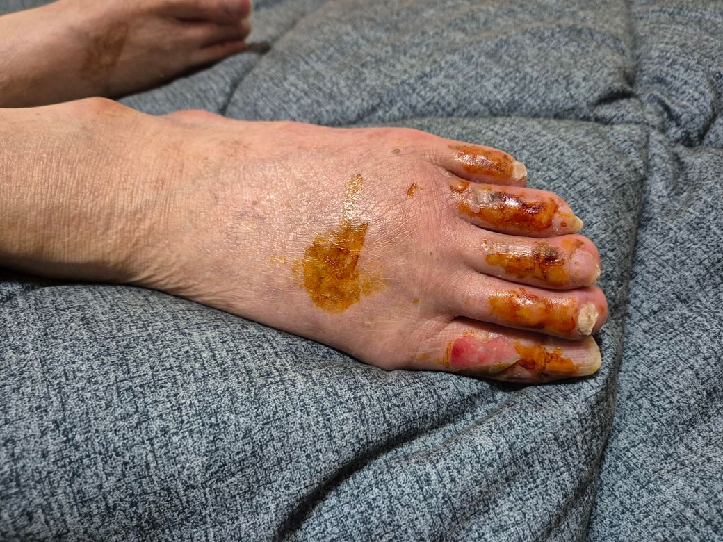 할아버지가 발이 부으시더니 (통증도 있었다고 해요) 어제 갑자기 발가락이 전부 터지면서 피가 나고 있어요 ㅜㅜ