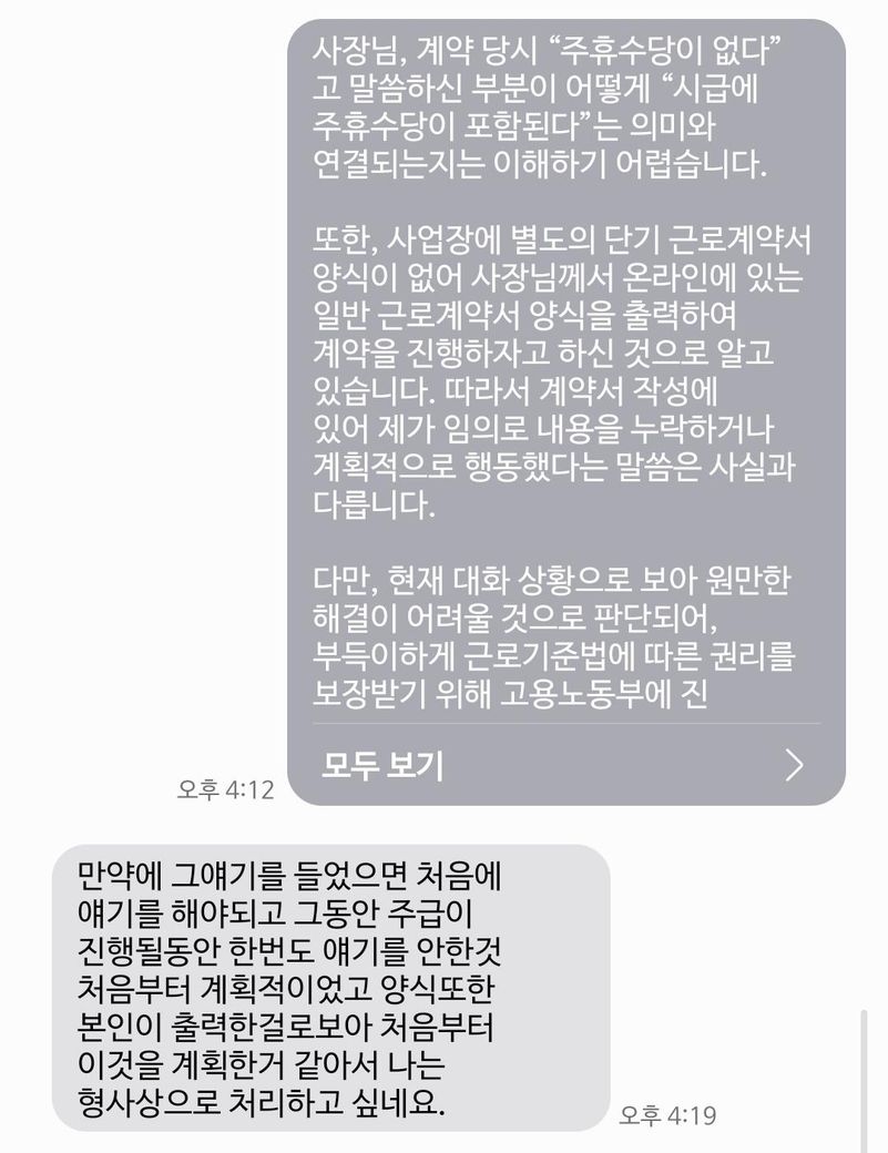 금일 문자로 주휴수당 지급 요청건으로 문자를 드렸으나 첨부한 이미지처럼 오히려 제 탓으로 몰고 가시며 마지막에 형사상으로 처리하고 싶다고 합니다. 협박에 가깝다고 느꼈는데 만일 형사상 고소가 되더라도 제 탓이 될까요?