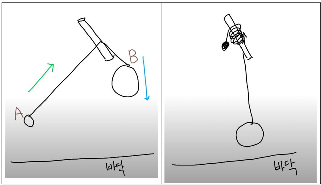 A 돌을 잡고 있다가 놓으면 줄이 막대기에 감기면서 B 돌이 바닥에 떨어지지 않는 실험입니다.