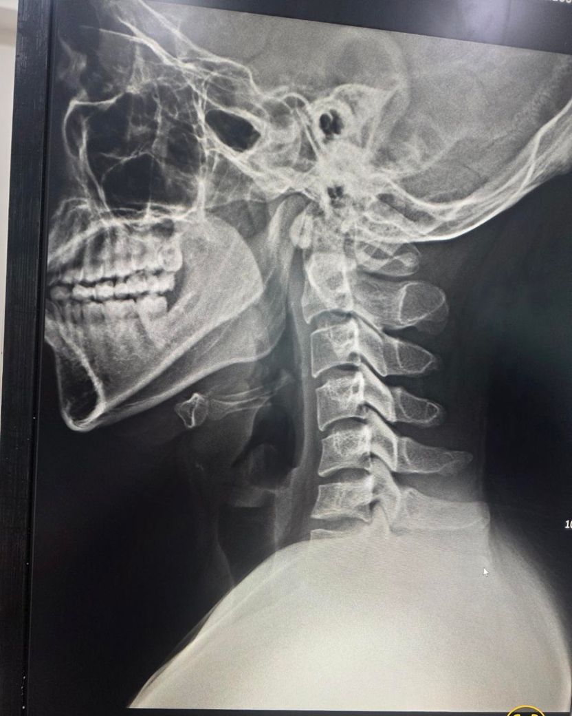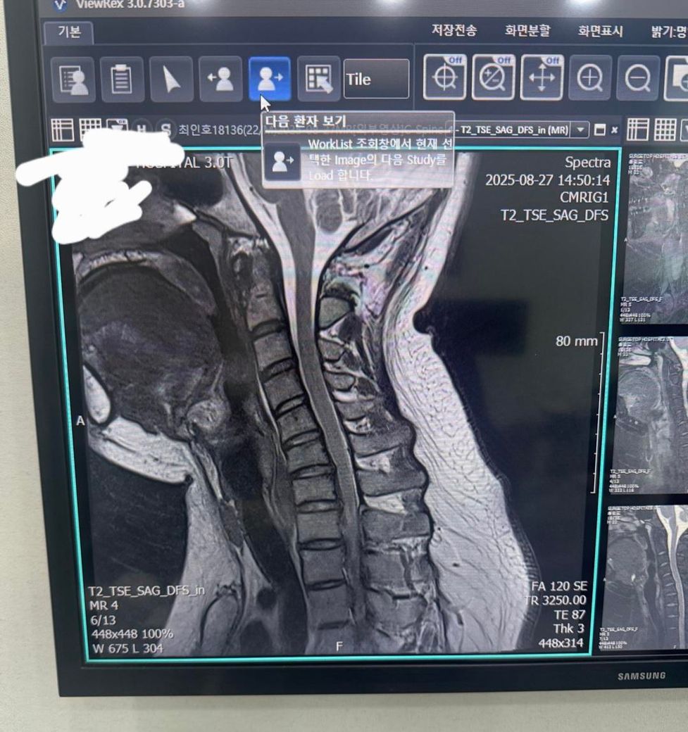 제시된 측면 X-ray와 시상면 MRI를 기준으로 보면, 경추 전만이 감소한 이른바 거북목 형태가 뚜렷하고, 하부 경추에서 디스크의 퇴행성 변화와 경미한 후방 돌출이 의심됩니다. MRI에서 척수는 연속성은 유지되며 뚜렷한 압박이나 신호 변화는 뚜렷하지 않아, 현재 단계는 “경추 정렬 이상 + 초기 디스크 퇴행/팽윤” 범주로 해석하는 것이 타당합니다. 즉 구조적 파열이나 심한 협착보다는, 자세와 근육 불균형에 의해 반복적으로 증상이 재발하는 상태에 가깝습니다.