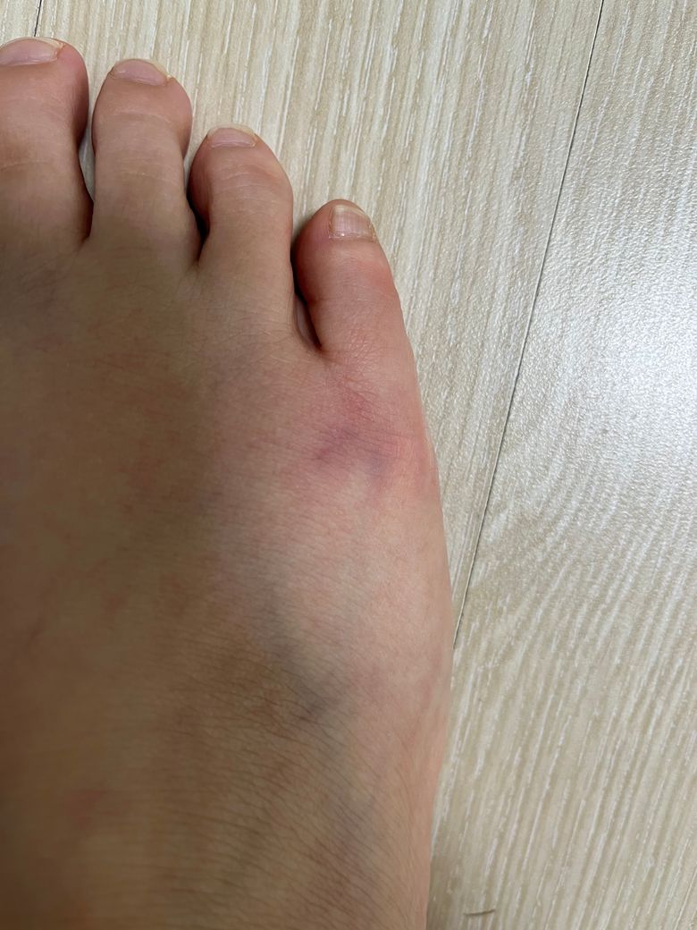 고구마 앞을 막아주는 비닐이 뜯어져있어서 고구마 들이 쏟아져 나왔고 그 때 발가락끝 뼈에도 떨어지면서 멍이